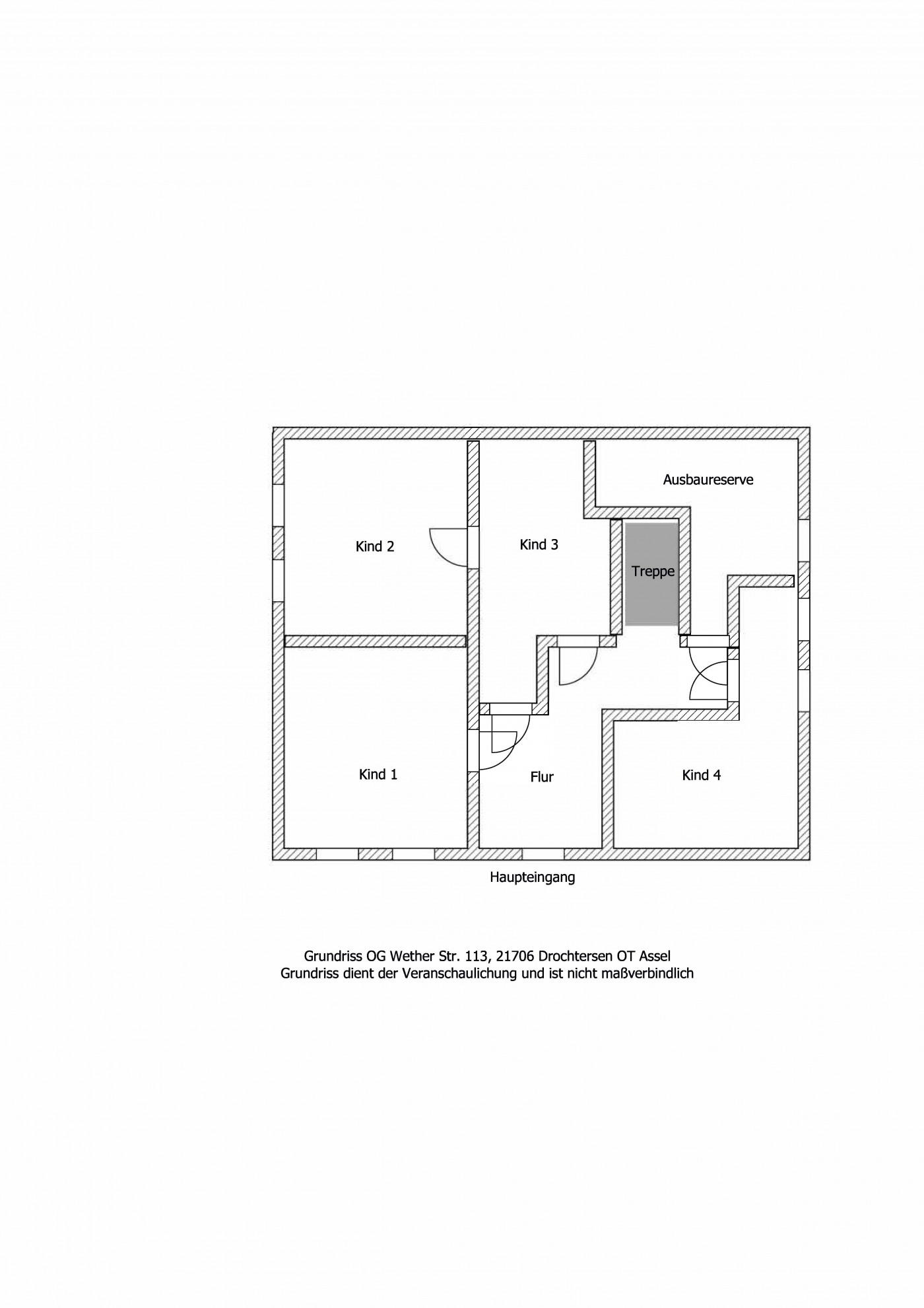 Das Erdgeschoss ist geprägt vom geräumigen Eingangsbereich, der ein Schlaf- oder Arbeitszimmer, den Wohn- und Essbereich, sowie die Küche um sich vereint. Das modernisierte Bad ergänzt das Raumangebot. Das Obergeschoss bietet, sehr typisch für diesen Haustyp, 4 weitere Schlaf-, Spiel- oder Arbeitszimmer. Hier bestünde die Möglichkeit, durch Installation eines zusätzlichen Bades für weiteren Komfort zu sorgen. Das Dachgeschoss bietet Stehhöhe und je nach Investitionsvolumen ließe es sich, z.B. durch Öffnung der Decke, mit dem Obergeschoss verbinden, um beispielsweise eine offene Galerie zu schaffen.